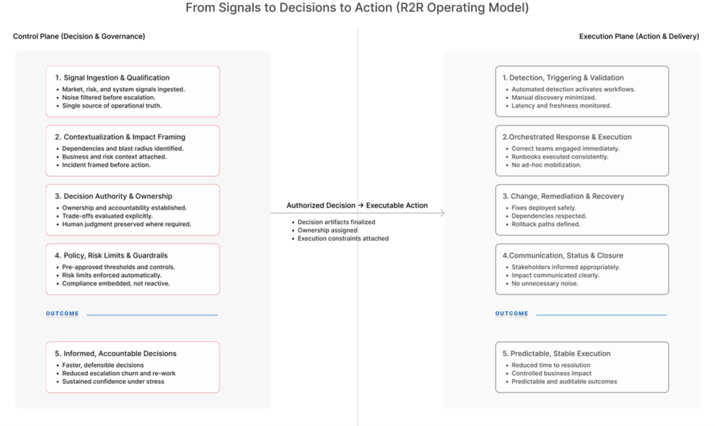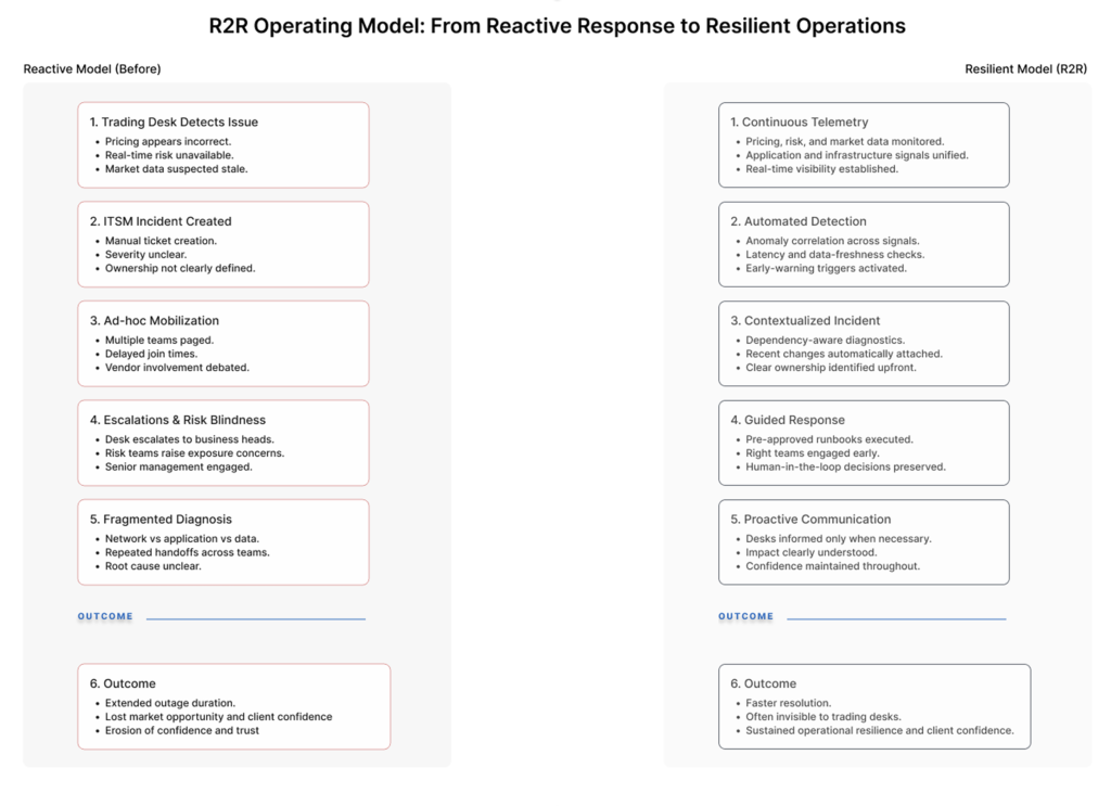 R2R is not a tool or a platform. Unlike traditional resilience initiatives that focus on tooling upgrades or isolated automation, R2R reframes Front-Office resilience as an operating-model discipline – integrating telemetry, AI, governance, and decision-making into a single, business-aligned framework.