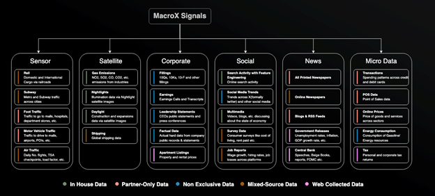 Fig 1: The MacroX Multimodal AI engines consumes many data sources with ~ 1000 data to signal pipelines, but organizes them into 6 major categories that are consistent across 14 countries.